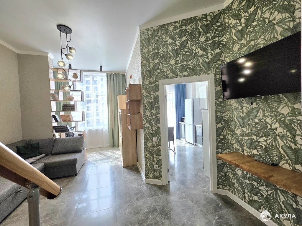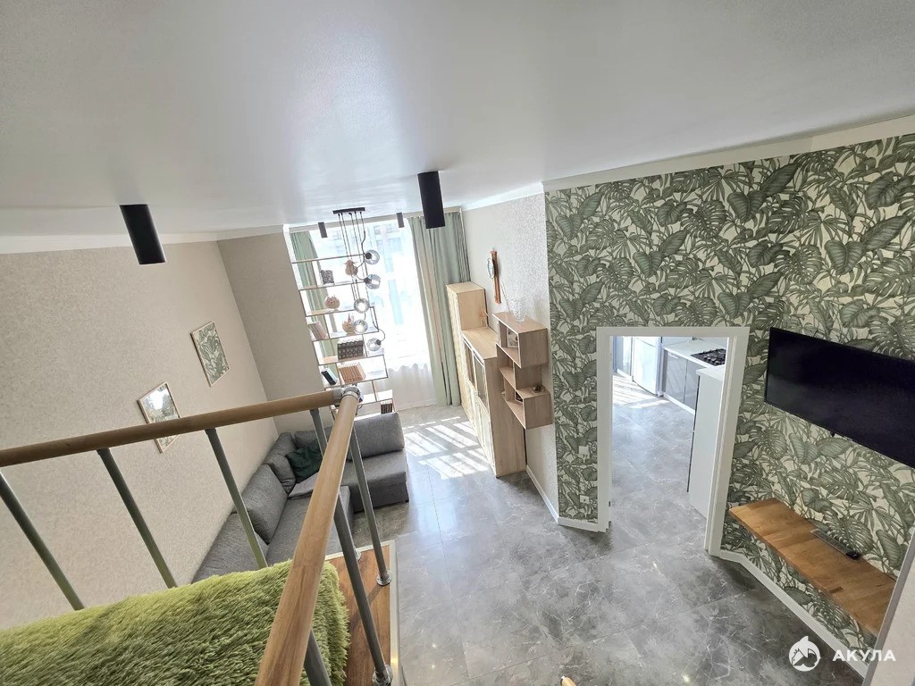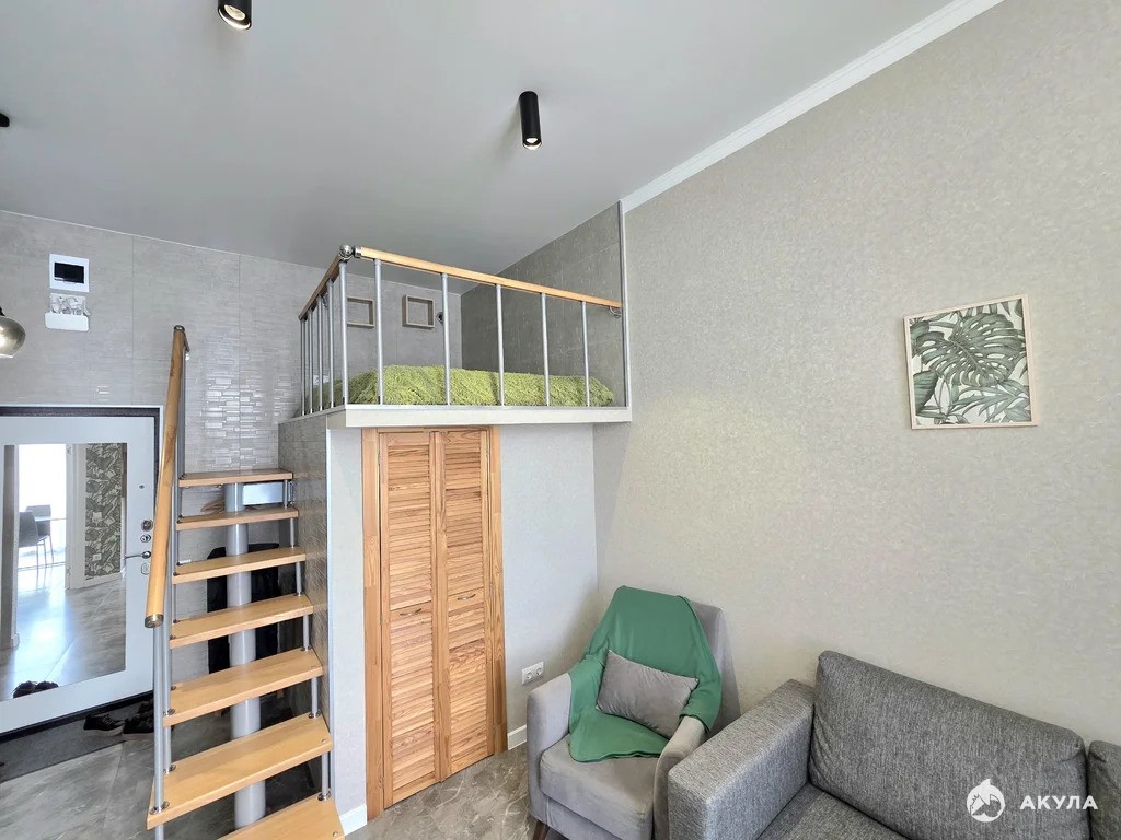 В самой квартире выполнен дизайнерский ремонт. За счет высоких потолков (3, 4м) выполнен второй ярус, на котором расположена двухспальная кровать 160*200, а под ней находится полноценная гардеробная с полками и вешалами.